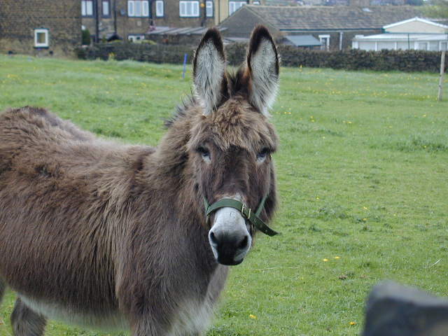 This is Rishworth. The valleys are steep and the local (Halifax) press is full of taxi drivers' violence fears. It's drunkenness or racism or both. There's a row of prefabs with neat, well kept gardens. There's a notice that says "regenerating Sowerby Bridge". In a cafe, the radio tells me that Corus Engineering Steels is to close Stocksbridge works near Sheffield. The woman who runs the cafe tells me it's a familiar story here too. There are many instances of people having to get new jobs which paid less than the people were earning years ago. People are not well off this side either. Wool has fared no better than cotton. The proprietor also regretted that children lived as consumers: they expected to have expensive toys which didn't entertain for long. They were better entertained being creators, making something from old cans or such. As I walked up Pye Nest Road, I kept getting hit by a burning smell. It was a while before I realised it was the brake linings of the HGV's coming down. Halifax is a land of mills and hills. After passing through, I was inclined to think its car friendliness made it unfriendly to people. There was an old mill building in Shelf used by "Interface Europe" - not sure what that was, but it's good to see these spaces used productively. Bradford bits... like the Science Park by the university, the city-run Interfaith Education Centre, "death to America", "new life in Jesus", and several police vehicles driving round and round, but no officers on foot. I was taken to Keighley where I was once again looked after brilliantly. Keighley is a town of only 60,000. You can see fields all around. The steam railway to Bronte country starts here. Yet my hosts pointed over the valley to where the twockers burned their cars. And people here don't have much money either. Pictures from today...Halifax proclaims itself "car friendly" A donkey - is Christ burdensome? |