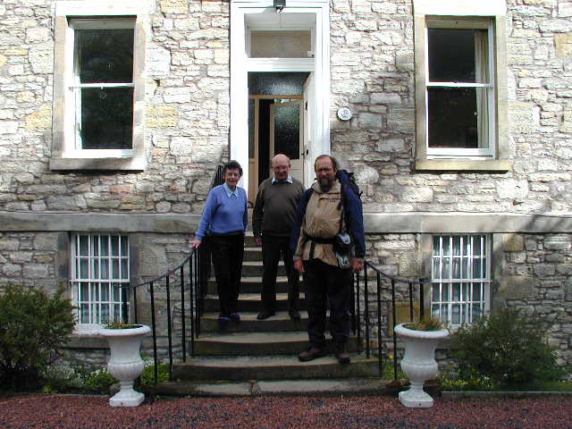 Yesterday evening there was a good thunderstorm with hail, the works. I was glad to be inside. Later, my hosts consented to be asked The Questions - as if they didn't already have enough to do, looking after me. I set off this morning and soon found a fairly quiet B road. It got quieter as I got further away from Kelso. From time to time, jets flew low across the landscape. There's something thrilling about seeing a fast aeroplane scream over your head doing a banked turn, with strings of cloud trailing from its wingtips. But it's not everybody's cup of tea, not if they've come for the quiet. If we're going to choose to go to war from time to time, the pilots have got to practise somewhere. In time, the road turned from brown on the map to yellow, and then to white, as I walked past a run of chicken sheds. I kept my distance, so as not to spread disease. Who knows, I might have created a new flu virus if I'd not been careful. The road became a track, and came out at Birkenside. By going through Blainslie, I was able to walk almost all the way into Lauder on small roads. In Blainslie I saw a young woman relaxing, looking at her garden. I had the impression she was surveying a good afternoon's work. She watched me walk up the hill. I felt the urge to greet her. A raised hand seemed right, anything more might have provoked too energetic a response. She replied in kind. I walked on. In mid afternoon, there seemed to be lots of mums driving the road between Lauder and Blainslie. I wondered if I was in commuting range of Edinburgh, along the A68 (although it was another two days for me). Support for this hypothesis came later, when a woman walked out of the post office with a cheery "ciao" to the postmaster. But the people at the place I'm staying say there aren't commuters out that way in any numbers. I passed the time on the road watching showers. I tried to think of words to describe them. But I couldn't really find the right ones. I just think showers are amazing. I got to the digs and rested and looked out of the window. There's a sooty television aerial to see: this is somewhere where people still burn fires. I look at the clouds. I think the wind has veered. And there's Lauderdale. Sun came and went on the valley sides. Seagulls were brilliant white in the sun against the dark cloudbase. That may be a familiar enough sight, but it feels good to have the leisure to watch. I thought about days to come, but didn't get far. I'll just have to take things as they come. Psalm 131 keeps coming into my mind. Pictures from today...Self, with hosts, about to set off from Kelso The Eildon Hills have been visible for about two days now. Anybody know if they're volcanic? The boy (who was being watched over by an adult in a car) standing next to this thing at Blainslie didn't know what it was. Could it be a penknife sculpture like that on Sheffield's Five Weirs Walk? It reads, 1 Duck Killed 1 Child Missed |