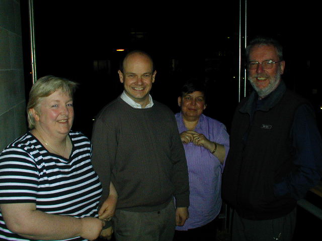 not deceptive. Chief answerer Richard Emblem writes... When I got back onto the main road into Edinburgh, there was good news and bad news. The Good News was there was a pavement beside the road. The Bad News was it was closed for roadworks. So more stumbling along roadside verges. But that section was soon past and the walking became easy. I was soon met by Scott Spurling, youth minister from Morningside United Church, and John Smith, minister/chauffeur, who took the bag. Scott walked with me all the way into St Colm's in Edinburgh. In the excitement of having such good company, I got carried away and forgot to be gentle on my feet, as a consequence of which they felt very hammered by the evening. As I write this the next morning, they're still a bit sore, but I think they're going to be alright. We had lunch in Mrs C's Snack Bar in the community centre in Gilmerton. I almost had square sausage, but failed to point to the correct tray. I thought there was a good atmosphere about the place. A number of people were smoking, but that didn't bother me. I think I'm not averse to a bit of passive smoking in some settings - it reminds me of Saturdays of my childhood. Other settings, especially on public transport, where it represents lawlessness, I hate it. Some snippets from the conversation along the way... Speed cameras: people in the US would laugh at the idea that unmarked speed cameras were "unfair". Milk prices: part of the attraction of Ben and Jerry's ice cream (in the independent days) was that you knew they paid fair and consistent prices to milk producers. Wal-Mart: there is anti- Wal-Mart feeling in some southern states where small stores have been put out of business. On the other hand, Wal-Mart generates jobs, albeit at low wages. After getting the key to St Colm's, I was taken (by car - wonderful!) to eat an Irn Bru sorbet and see Morningside United Church. Details of the Eric Liddell Centre can be found in "Reform", readable on the United Reformed Church website. Cars are a major problem in Edinburgh. They get in the way of other cars trying to move, and they get in the way of other cars trying to park. Edinburgh is full of stories of over-zealous traffic wardens, like the pregnant woman who got a ticket when she stopped to be sick, the broken-down bin lorry that was ticketed while the police were there directing traffic around it, the hearse, the stolen car, whose owner had to pay the ticket incurred by the thieves. Believe these if you will. Later in the evening I was fed, and church leaders and family from Morningside consented to answer The Questions. ISTR The Questions are up in some form on the walk planning website. I'll post them on this diary when I've a little more time. I really have been looked after kindly here. Pictures from today...Tower in Dalkeith ... Suggestions? Site of the Edinburgh fire Some people from Morningside United Church |
