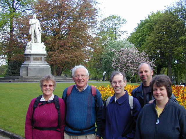 It was a relatively light day's work, with some heavy showers, all of them somewhere else. It was good to have some people walking with me, and Keith from Keighley and Bernie Collins, the Synod Training Officer, went all the way. Once again, the conversation makes the time pass. We went by the park, quiet back streets, the canal, a country lane and footpaths, so it was easy on the ears and the nerves. Esholt, it seems, was the original setting for Emmerdale Farm (as it was then), but I declined to take a photo of the Woolpack on the grounds that I was not going to look like a tourist. What I actually look like, with these Morecambe [sp?] and Wise trousers, I prefer not to think. Over the Chevin (the second I've climbed on this walk), with its massive Churches Together at Easter cross, and down to a welcome cup of tea at Otley, the town of Chippendale (the furniture maker, not the stripper), before saying goodbye to the support and finding my billet. That was it. A nice day. Pictures from today...Supporters in Lister Park, Bradford Supporters by the Leeds - Liverpool Canal near Shipley Sheep at farm park, Esholt Cross on the Otley Chevin |