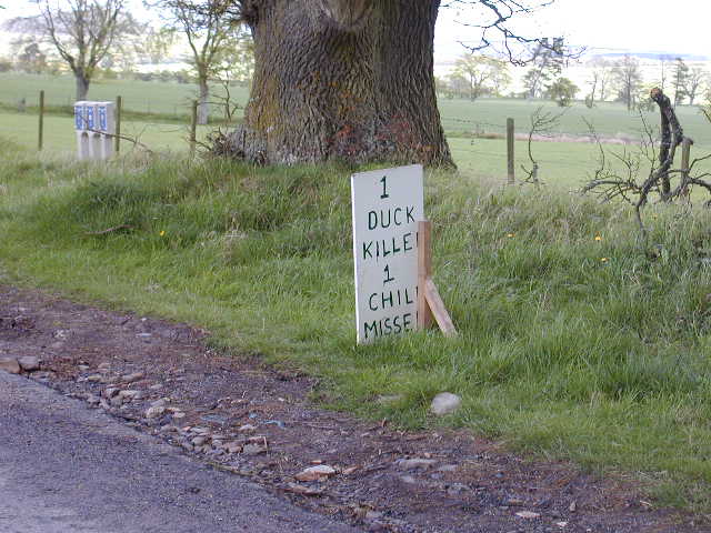 Yesterday evening there was a good thunderstorm with hail, the works. I was glad to be inside. Later, my hosts consented to be asked The Questions - as if they didn't already have enough to do, looking after me. I set off this morning and soon found a fairly quiet B road. It got quieter as I got further away from Kelso. From time to time, jets flew low across the landscape. There's something thrilling about seeing a fast aeroplane scream over your head doing a banked turn, with strings of cloud trailing from its wingtips. But it's not everybody's cup of tea, not if they've come for the quiet. If we're going to choose to go to war from time to time, the pilots have got to practise somewhere. In time, the road turned from brown on the map to yellow, and then to white, as I walked past a run of chicken sheds. I kept my distance, so as not to spread disease. Who knows, I might have created a new flu virus if I'd not been careful. The road became a track, and came out at Birkenside. By going through Blainslie, I was able to walk almost all the way into Lauder on small roads. In Blainslie I saw a young woman relaxing, looking at her garden. I had the impression she was surveying a good afternoon's work. She watched me walk up the hill. I felt the urge to greet her. A raised hand seemed right, anything more might have provoked too energetic a response. She replied in kind. I walked on. In mid afternoon, there seemed to be lots of mums driving the road between Lauder and Blainslie. I wondered if I was in commuting range of Edinburgh, along the A68 (although it was another two days for me). Support for this hypothesis came later, when a woman walked out of the post office with a cheery "ciao" to the postmaster. But the people at the place I'm staying say there aren't commuters out that way in any numbers. I passed the time on the road watching showers. I tried to think of words to describe them. But I couldn't really find the right ones. I just think showers are amazing. I got to the digs and rested and looked out of the window. There's a sooty television aerial to see: this is somewhere where people still burn fires. I look at the clouds. I think the wind has veered. And there's Lauderdale. Sun came and went on the valley sides. Seagulls were brilliant white in the sun against the dark cloudbase. That may be a familiar enough sight, but it feels good to have the leisure to watch. I thought about days to come, but didn't get far. I'll just have to take things as they come. Psalm 131 keeps coming into my mind. Pictures from today...Self, with hosts, about to set off from Kelso The Eildon Hills have been visible for about two days now. Anybody know if they're volcanic? The boy (who was being watched over by an adult in a car) standing next to this thing at Blainslie didn't know what it was. Could it be a penknife sculpture like that on Sheffield's Five Weirs Walk? It reads, 1 Duck Killed 1 Child Missed |