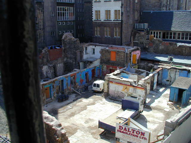 not deceptive. Chief answerer Richard Emblem writes... When I got back onto the main road into Edinburgh, there was good news and bad news. The Good News was there was a pavement beside the road. The Bad News was it was closed for roadworks. So more stumbling along roadside verges. But that section was soon past and the walking became easy. I was soon met by Scott Spurling, youth minister from Morningside United Church, and John Smith, minister/chauffeur, who took the bag. Scott walked with me all the way into St Colm's in Edinburgh. In the excitement of having such good company, I got carried away and forgot to be gentle on my feet, as a consequence of which they felt very hammered by the evening. As I write this the next morning, they're still a bit sore, but I think they're going to be alright. We had lunch in Mrs C's Snack Bar in the community centre in Gilmerton. I almost had square sausage, but failed to point to the correct tray. I thought there was a good atmosphere about the place. A number of people were smoking, but that didn't bother me. I think I'm not averse to a bit of passive smoking in some settings - it reminds me of Saturdays of my childhood. Other settings, especially on public transport, where it represents lawlessness, I hate it. Some snippets from the conversation along the way... Speed cameras: people in the US would laugh at the idea that unmarked speed cameras were "unfair". Milk prices: part of the attraction of Ben and Jerry's ice cream (in the independent days) was that you knew they paid fair and consistent prices to milk producers. Wal-Mart: there is anti- Wal-Mart feeling in some southern states where small stores have been put out of business. On the other hand, Wal-Mart generates jobs, albeit at low wages. After getting the key to St Colm's, I was taken (by car - wonderful!) to eat an Irn Bru sorbet and see Morningside United Church. Details of the Eric Liddell Centre can be found in "Reform", readable on the United Reformed Church website. Cars are a major problem in Edinburgh. They get in the way of other cars trying to move, and they get in the way of other cars trying to park. Edinburgh is full of stories of over-zealous traffic wardens, like the pregnant woman who got a ticket when she stopped to be sick, the broken-down bin lorry that was ticketed while the police were there directing traffic around it, the hearse, the stolen car, whose owner had to pay the ticket incurred by the thieves. Believe these if you will. Later in the evening I was fed, and church leaders and family from Morningside consented to answer The Questions. ISTR The Questions are up in some form on the walk planning website. I'll post them on this diary when I've a little more time. I really have been looked after kindly here. Pictures from today...Tower in Dalkeith ... Suggestions? Site of the Edinburgh fire Some people from Morningside United Church |
