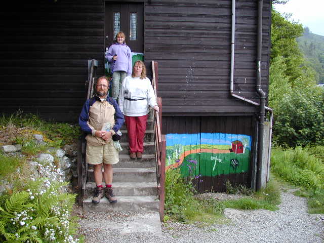 The persistence of yellow flowers... I'm still seeing primroses after two months. And I had not realised there was so much gorse in Britain. Nevertheless, I think on the whole that the spring is beating me on the journey northwards. Anyway, today was a good day, because colleague Chris and daughter Hannah walked with me all the way. And when they weren't chatting with me, they could chat with each other. Hannah walked ten miles for the first time in her life, and climbed well over 300m into the bargain. Welcome to the walking Warwickers, Hannah! With three pairs of eyes, we saw more things, like some fierce wood ants for instance. Only Nessie failed to oblige with an appearance. It seems that several thousand local people have made sworn statements saying they've seen the monster. Well done them! Each statement is probably worth a couple of thousand pounds a year to the local economy. It's not everywhere you see such public spiritedness. Because Nessie, stunning views of the loch, Urquhart Castle, little craft workshops... tourism is practically the only show in town. A large proportion of houses here are B&B's. And Drumnadrochit must be doing reasonably OK on it, because food prices, for what you get, are quite expensive. All very well, but what happens in winter? Service a few sheep an cut down a few trees? Judging by the accents, some of the labour comes for the season, like the antipodeans in the west highlands. A number of B&B proprietors may be retired and have enough to tide themselves over. I'm really just speculating though. It would be good to come in the rain-lashed dead of winter, just to see. Pictures from today...The family at the youth hostel by Loch Ness Loch Ness from high - no monster visible |